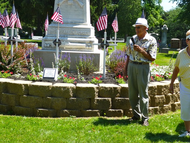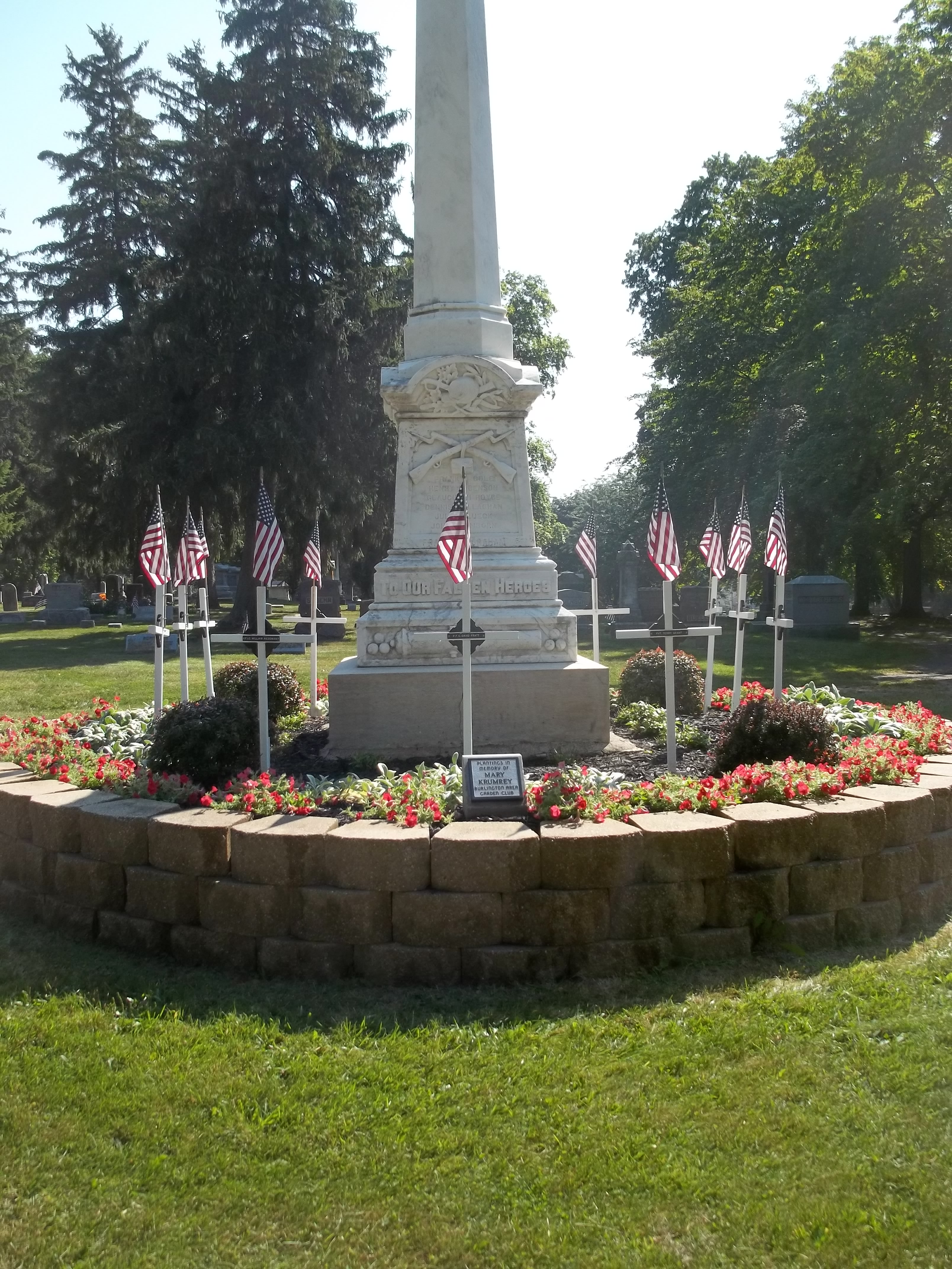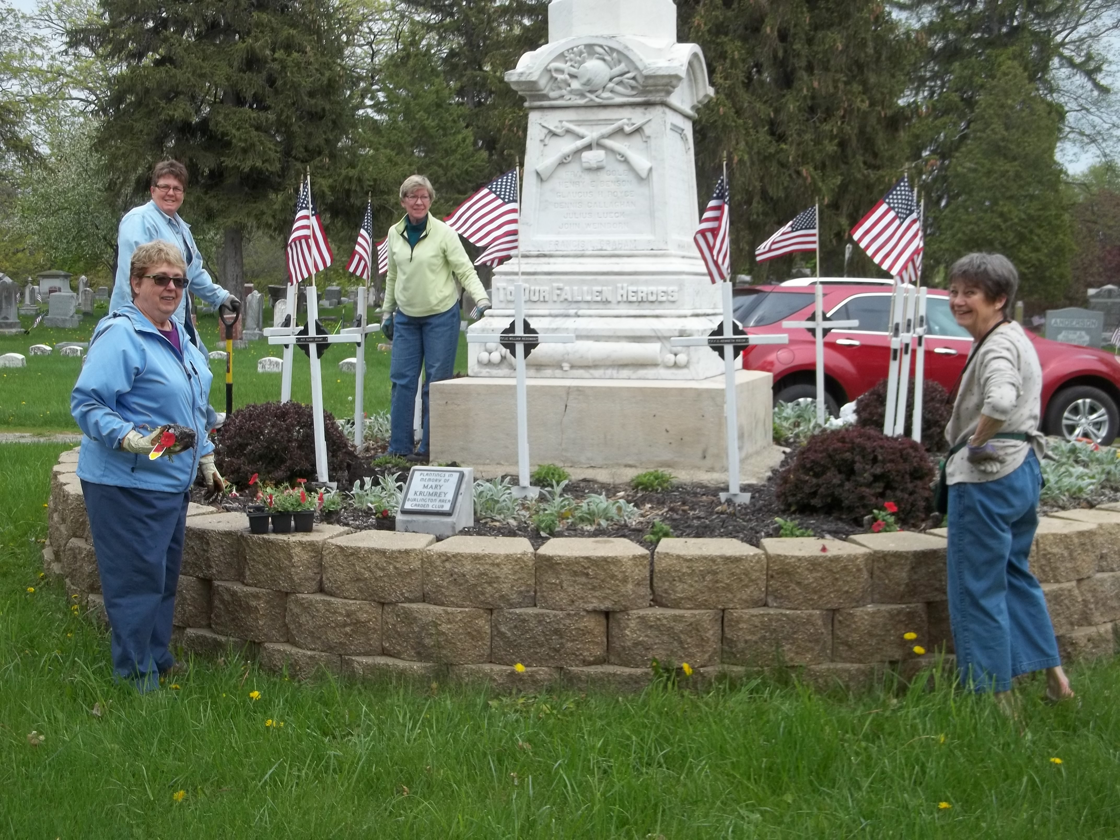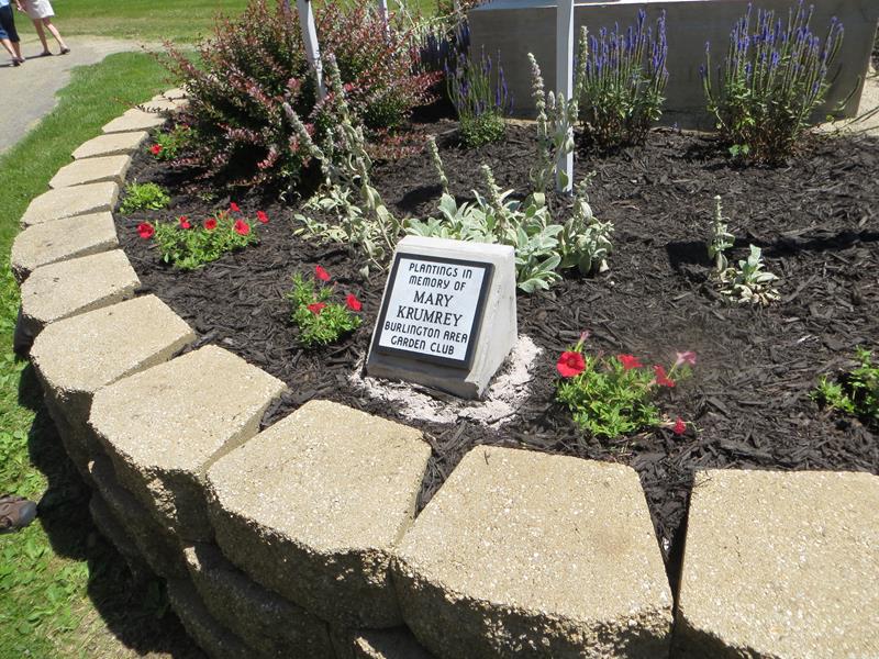 This garden brought the Burlington Area Garden Club and the American Legion together in beautifying the Veterans Memorial Statue in the Burlington Cemetery. The Garden Club planted the barberry bushes, mums, lamb’s ear and speedwell in the garden that circles the monument on a raised bed. Mary and Ed Krumrey and member Marge Koenecke were primarily responsible for the plantings. The garden now contains a memorial plaque for former member Mary Krumrey. The club members continue to plant and tend the garden of perennials and annual flowers and bushes. Come drive by and take a look sometime! It’s located in the Burlington Cemetery (visible from the road) on Browns Lake Rd. (County W) just north of Hwy 11.
