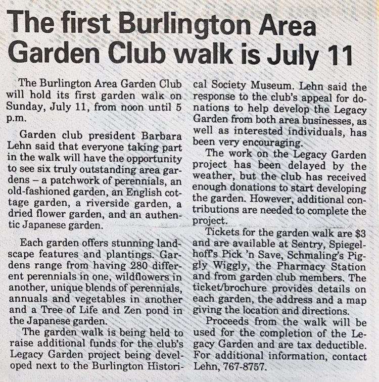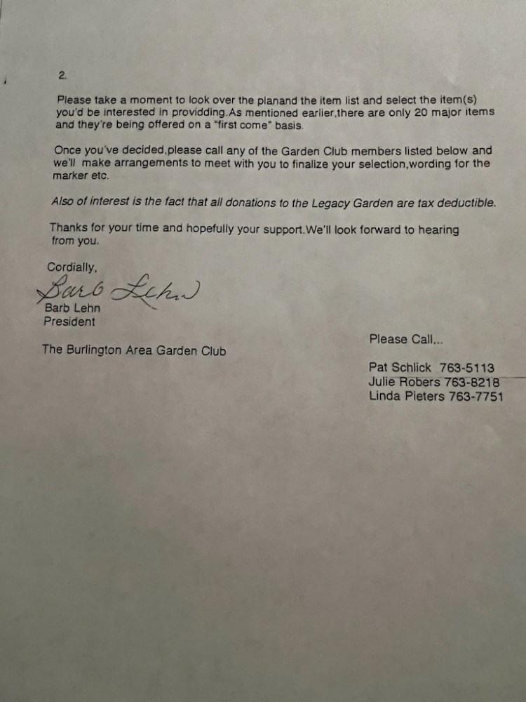 Letter sent out to obtain donations for the creation of the Legacy Garden – 1993