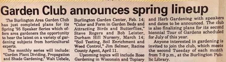 Newspaper clipping inviting the community to a Garden Club meeting – March 1995