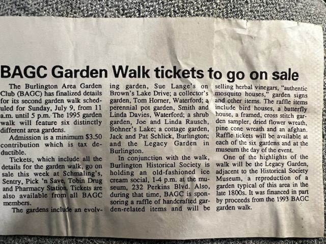 Newspaper clipping advertising the 1995 Garden Tour – 1995