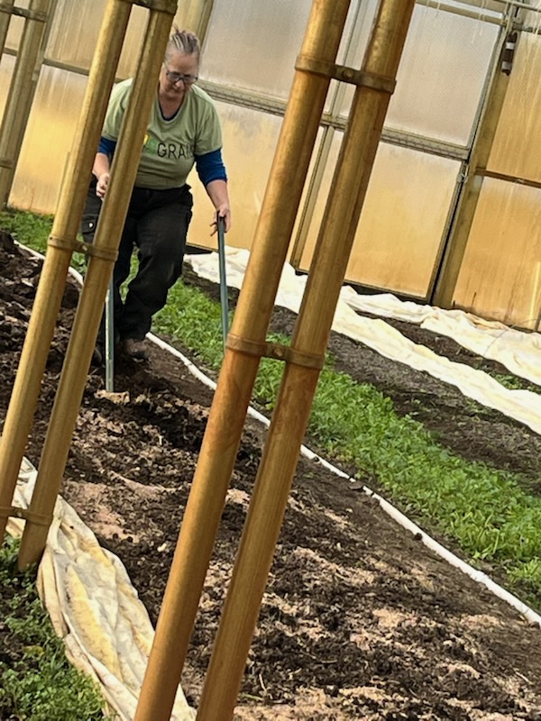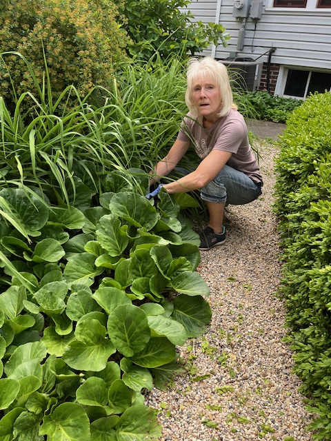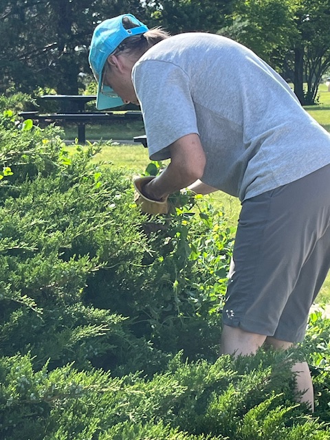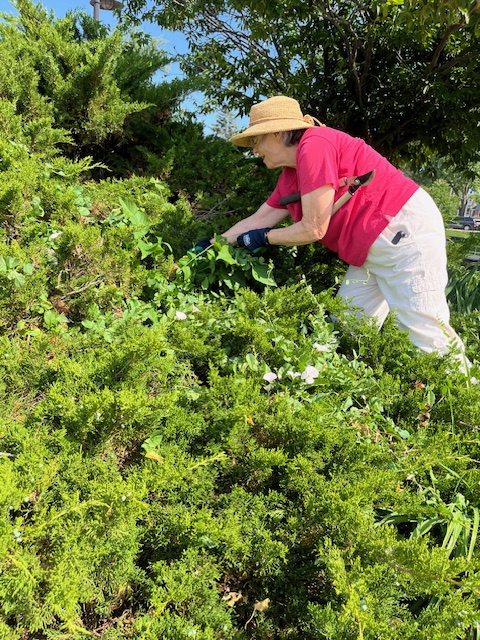 Pulling the bindweed in the shrubbery by the Statue Garden (member Carol Kohn) – June 2025