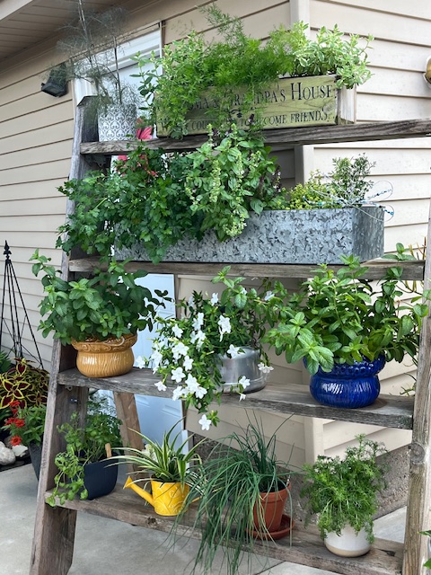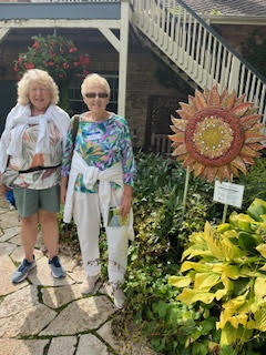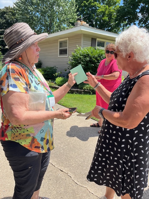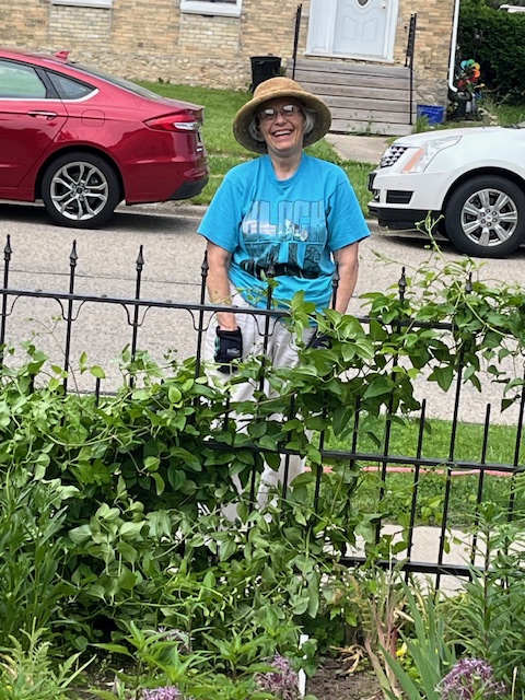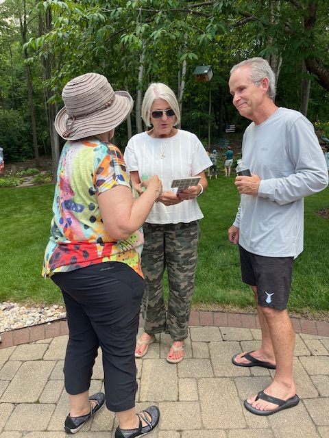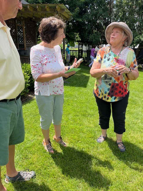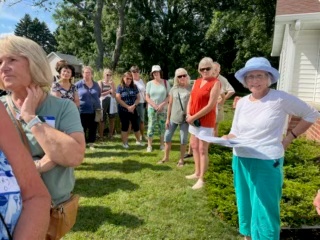 Garden Tour coordinator Mary Cichocki presents plaques to Garden Tour owners as thanks for showing their gardens – July 2025