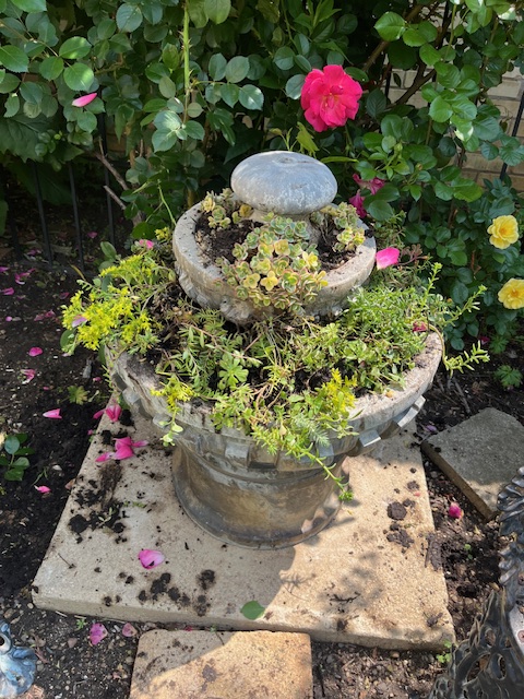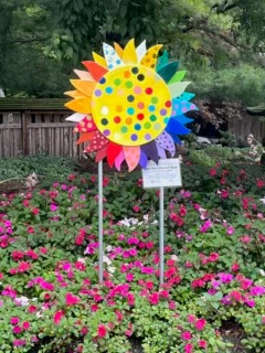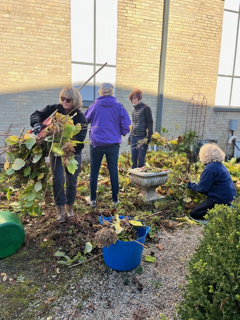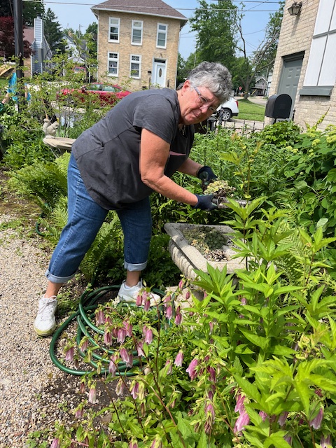 Members working in the Legacy Garden – We changed the fountain over to flowers as it was too difficult to keep the water running. – June 2025