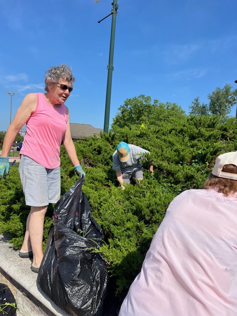 Pulling the bindweed in the shrubbery by the Statue Garden (members Peggy Wettengal and Marge Koenecke) – June 2025