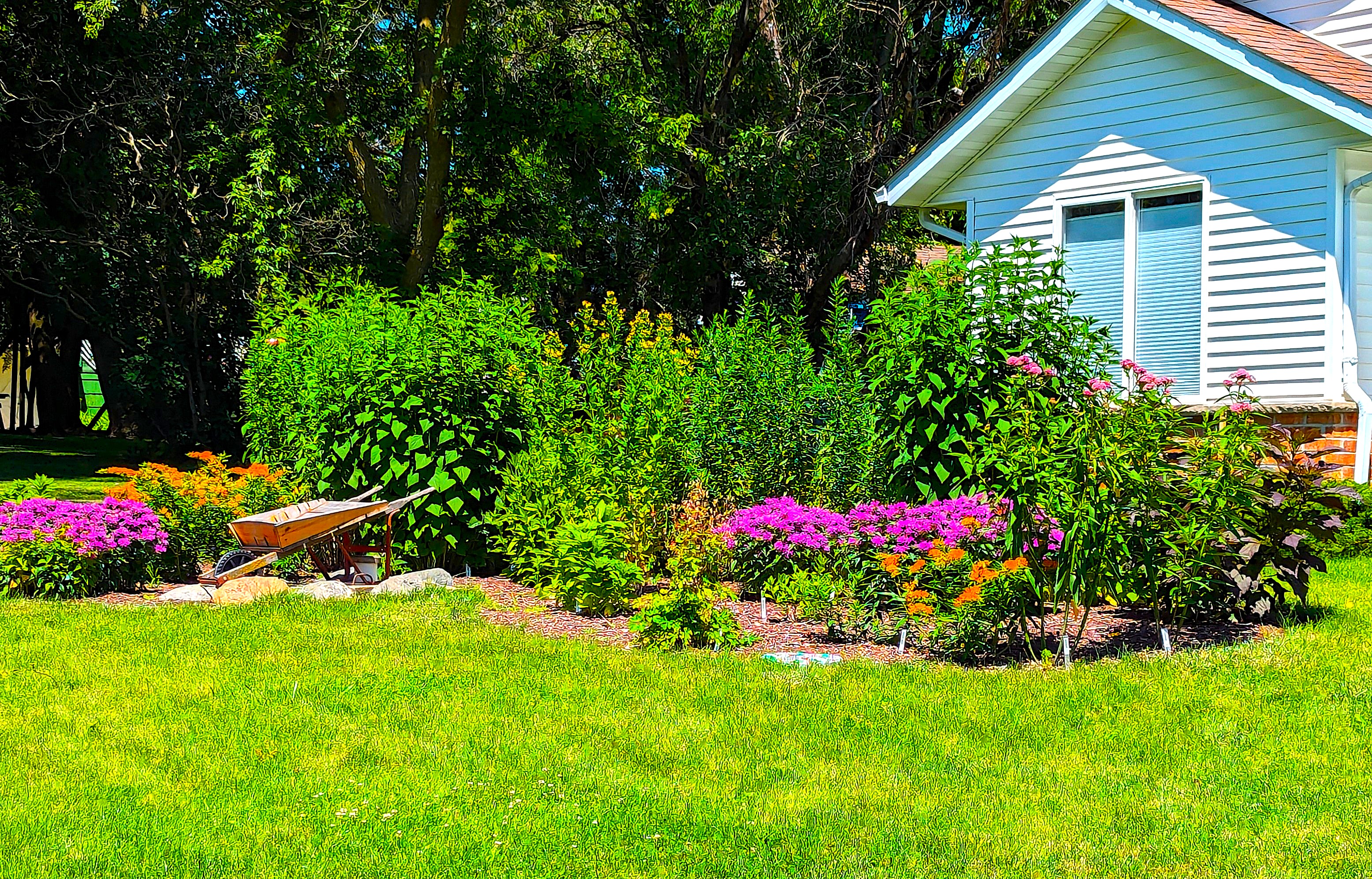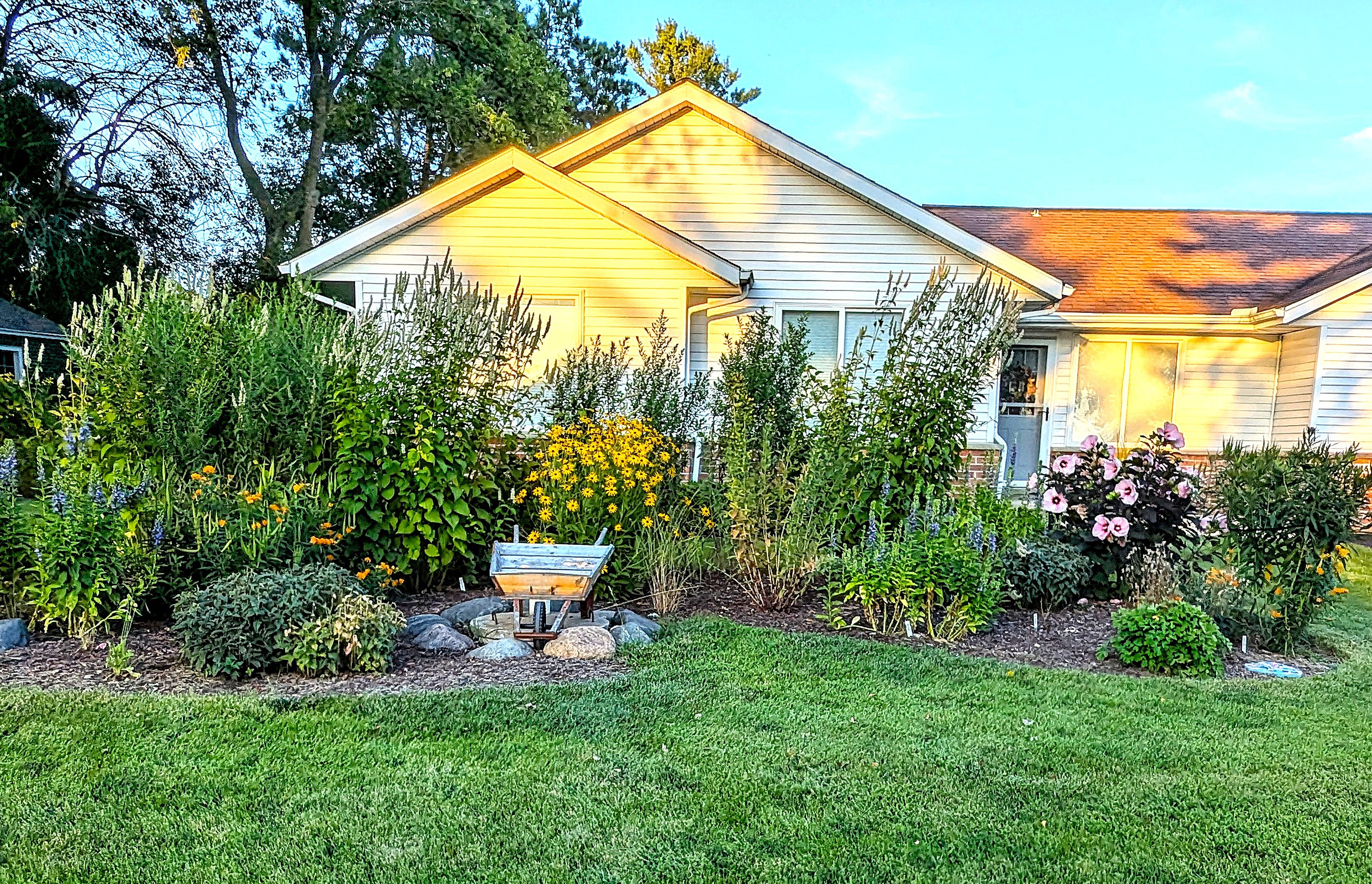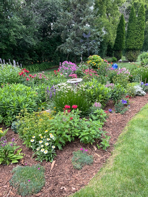 BAGC member Carol Kohn’s native plant garden, with blooms of summer. Though very mature, the garden is only 3 years old. – August 2025