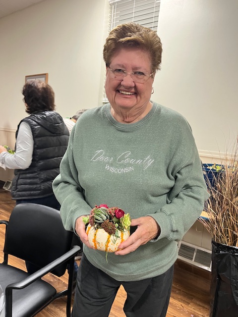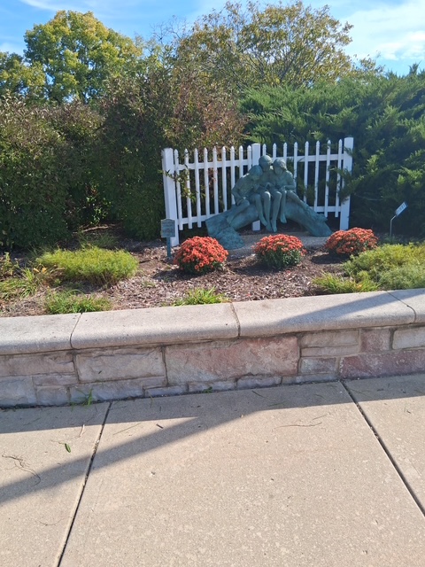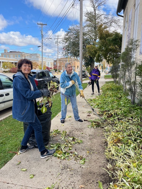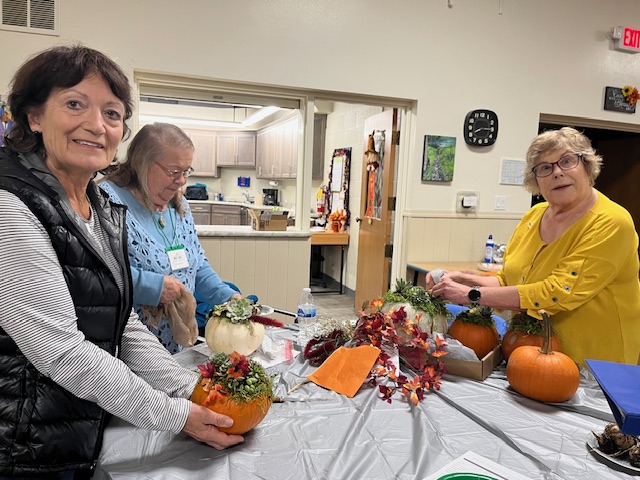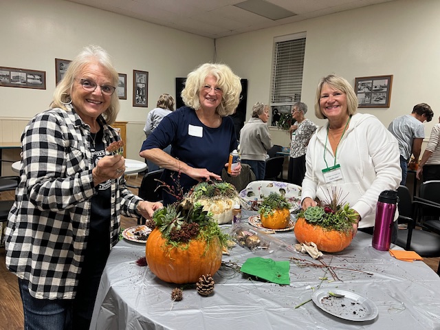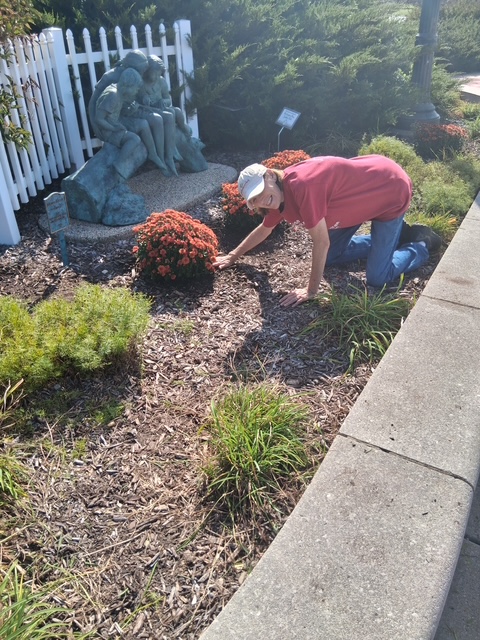Member Marge planting chrysanthemums for fall beauty in the Statue Garden – October 2025