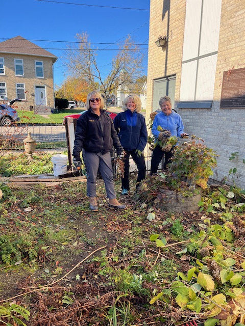 Pulling the bindweed in the shrubbery by the Statue Garden (members Shelley Hildebrandt, Peggy Wettengal, and Marge Koenecke) – June 2025